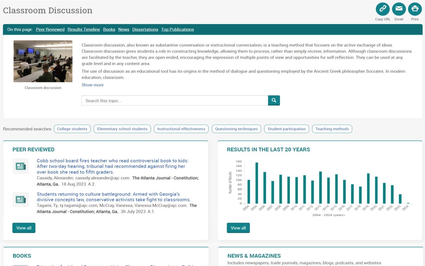 Topic Pages bring together a curated selection of relevant articles, videos, books, dissertations and more, to provide students and researchers with a convenient, all-in-one perspective on a topic and help faculty create course materials for assignments and discussion.